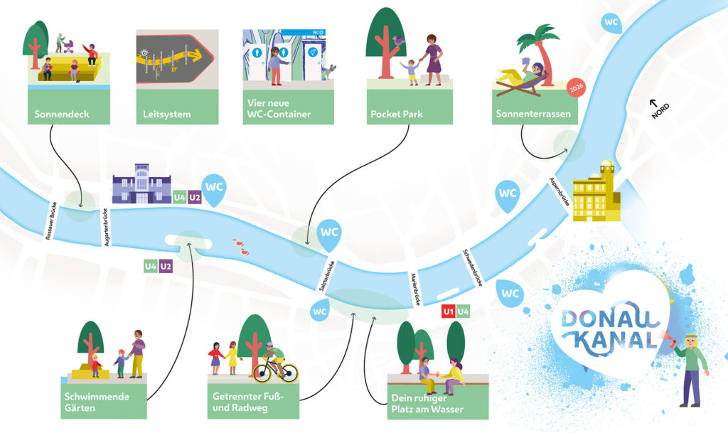 Wiens innerstädtische Freizeitoase am Wasser ist jetzt noch grüner und attraktiver. Seit 2020 wird begrünt, entsiegelt und umgestaltet: Eine schöne Uferpromenade mit getrennten Fuß- und Radwegen, konsumfreie Zonen, kunstvoll gestaltete „stille Örtchen“ und zahlreiche schattige Aufenthaltsplätze sind bereits entstanden. Auch 2026 wird es Neues zu entdecken geben! ➔ Mehr dazu