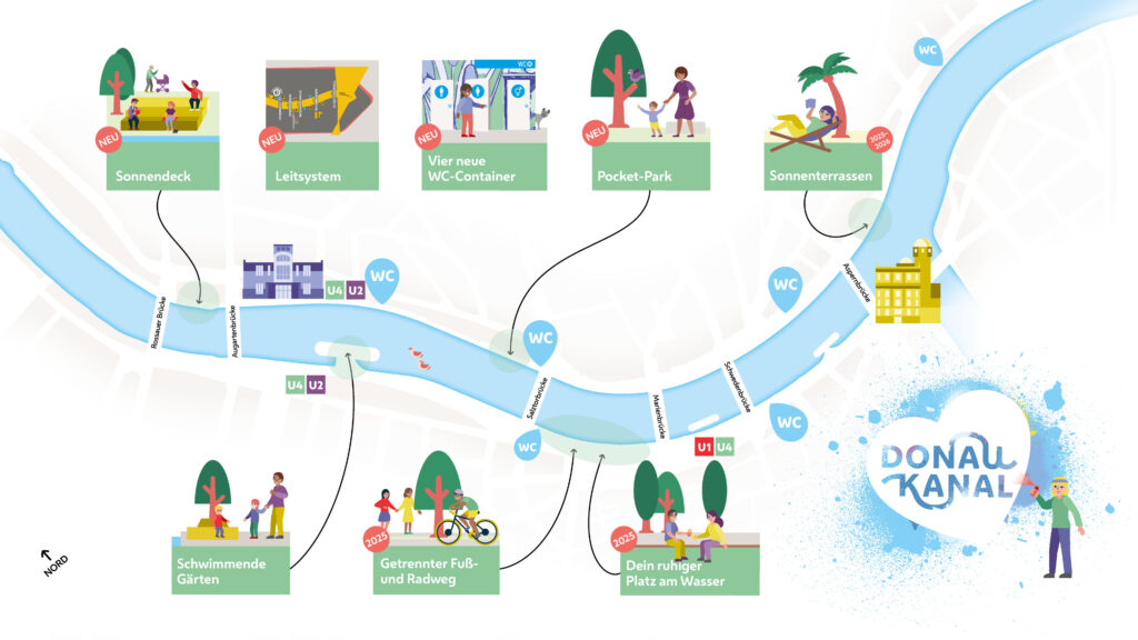 Wiens innerstädtische Freizeitoase am Wasser wird jetzt noch grüner und attraktiver. Seit 2020 wird entlang der beiden Ufer des Donaukanals begrünt und entsiegelt; auch zahlreiche konsumfreie Zonen wurden und werden geschaffen. Mit viel Liebe zum Detail entstanden und entstehen coole „Örtchen“, schattige Plätze am Wasser und ein ansprechendes Leitsystem. Auch 2025 und 2026 wird es Neues zu entdecken geben.