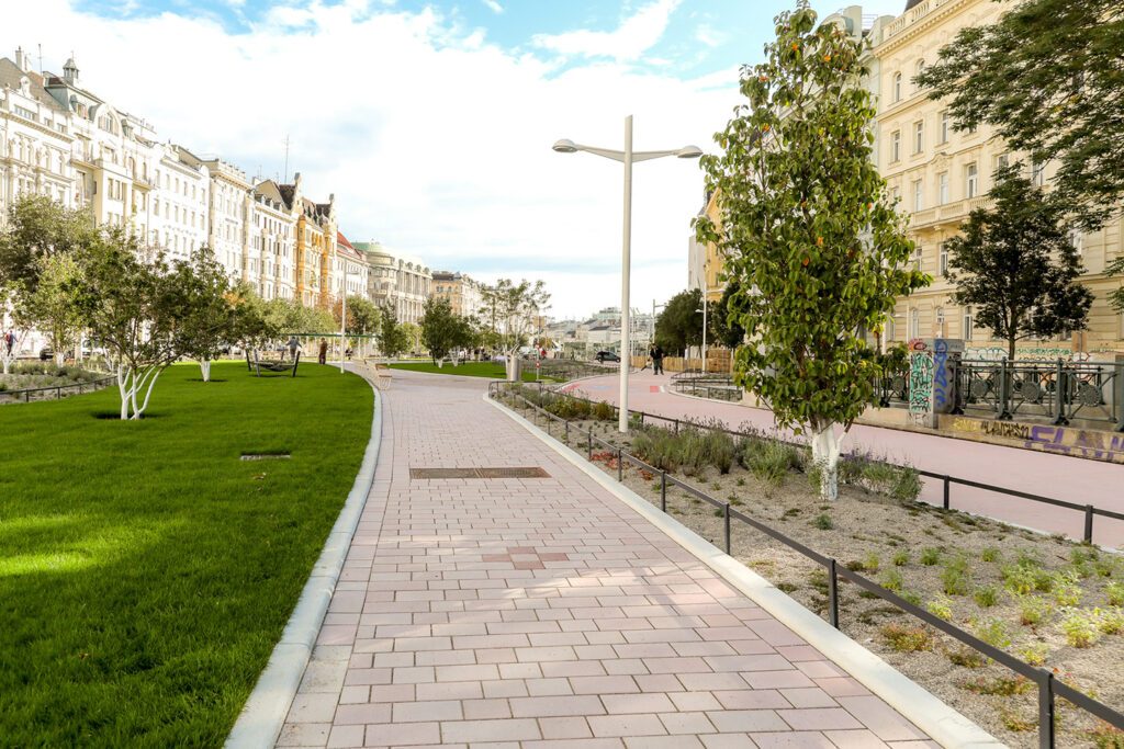 In klimafittem Glanz erstrahlt der neugestaltete Praterstern: Aus dem hochfrequentierten Verkehrsknotenpunkt mit über 150.000 Fahrgästen pro Tag wurde eine klimafitte Aufenthaltsoase. Im Zuge der Neugestaltung wurde die Anzahl der Bäume auf über 100 verdoppelt, die Grünflächen auf über 8.000 m² ebenfalls verdoppelt und das größte Wasserspiel der Stadt auf 500 m² installiert. 13 neue sogenannte XL-Platanen, die bei ihrer Pflanzung schon über 25 Jahre alt waren und daher große Baumkronen haben, sorgen seit Beginn an für Schatten und Kühlung. Dazu säumt ein 2,5 Meter breiter, begrünter und bunt bepflanzter Gräser-Ring auf 1.400 Quadratmetern den gesamten Praterstern und sorgt neben guten Mikroklima auch für eine wahre Augenweide.