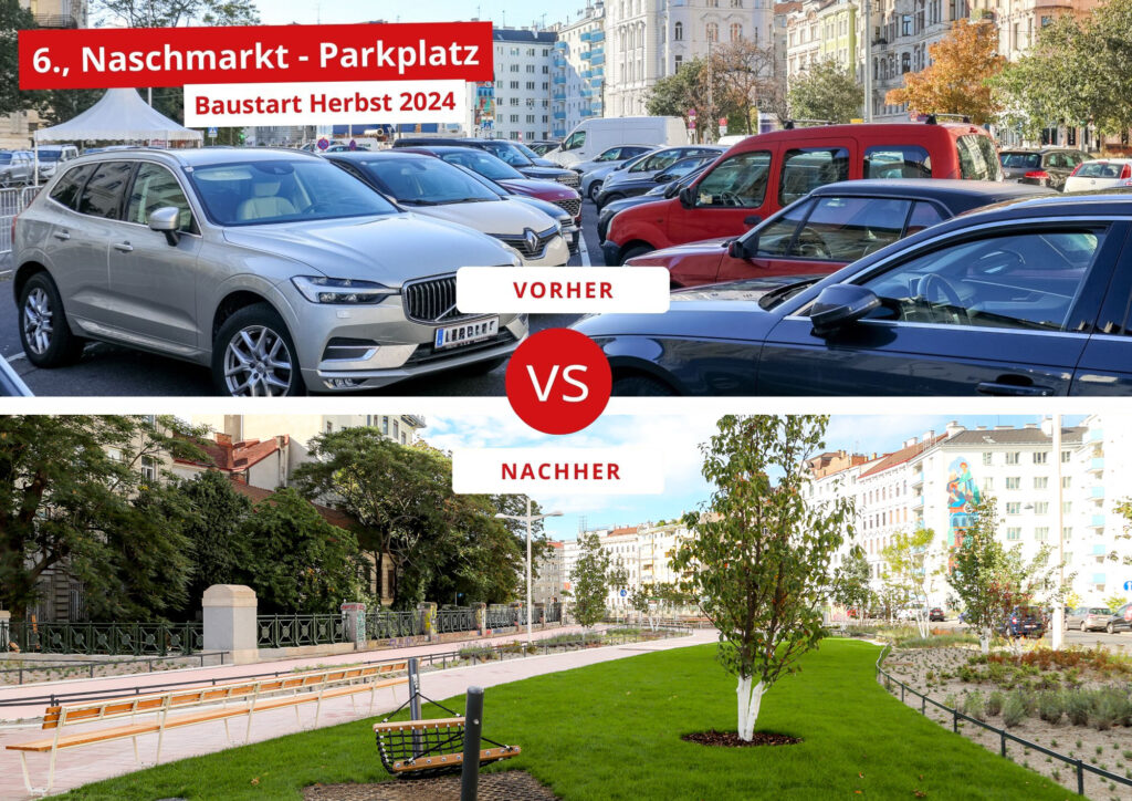 Seit Herbstbeginn 2024 laufen die umfangreichen Arbeiten: Aus dem riesigen Parkplatz wird eine großzügige Grün- und Freifläche, der Flohmarkt bleibt erhalten, und der Naschmarkt bekommt neuen Marktraum mit Platz für regionale Produzent*innen.