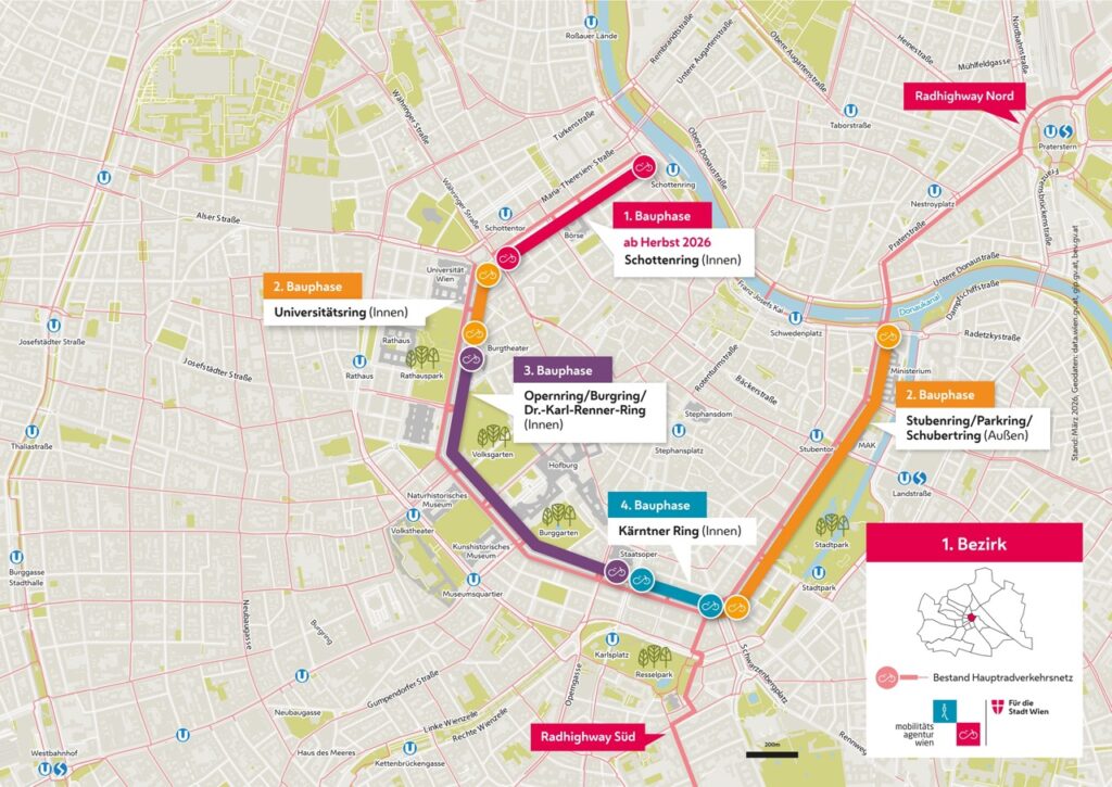 Ab Herbst 2026 wird die etappenweise Umgestaltung auf dem rund 700 m langen Schottenring begonnen – und zwar auf der Innenseite zwischen den U-Bahn-Stationen Schottentor und Schottenring. Die Außenseite bleibt unverändert. Die Nebenfahrbahn wird zur Rad-Allee mit einem 4,50 m breiten Zwei-Richtungs-Radweg. In einzelnen Abschnitten bleibt eine Zufahrt möglich. Insgesamt werden mehr als 900 m² neue Grünflächen und Beete entlang des inneren Schottenrings geschaffen. 12 neue Bäume werden alleine in diesem Abschnitt gepflanzt.